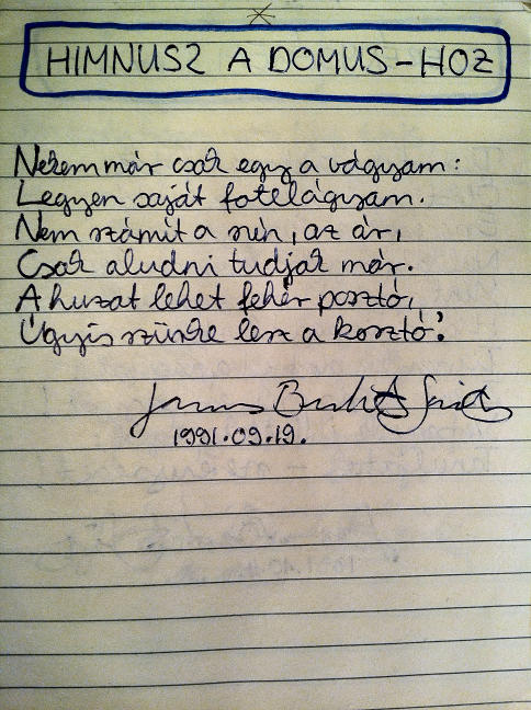 Nekem már csak egy a vágyam: Legyen saját fotelágyam! Nem számít a szín, az ár, Csak aludni tudjak már! A huzat lehet fehér posztó, Úgyis szürke lesz a kosztó'.