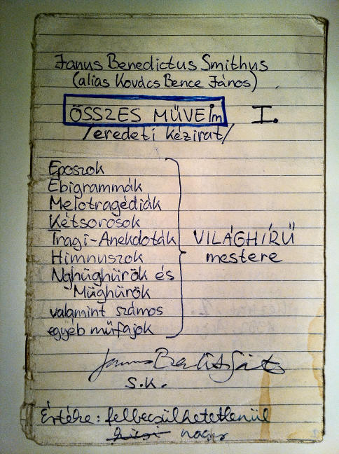 Ez a képgaléria a "Janus Benedictus Smithus: ÖSSZES MŰVEI(m) I." eredeti kéziratának iPhone 4-es készülékkel megörökített vizuális lenyomatait tartalmazza.